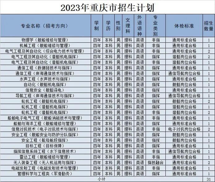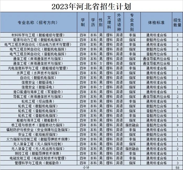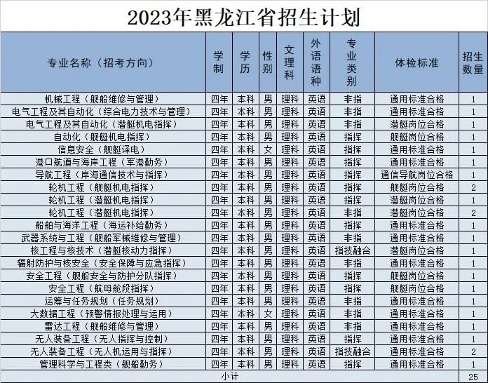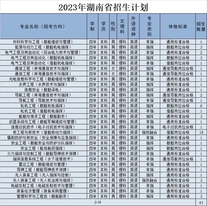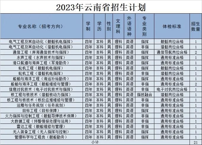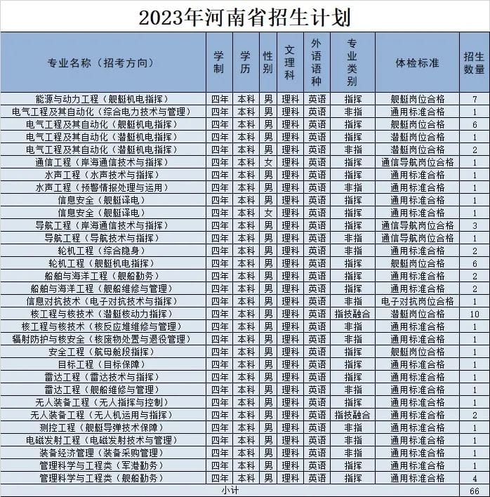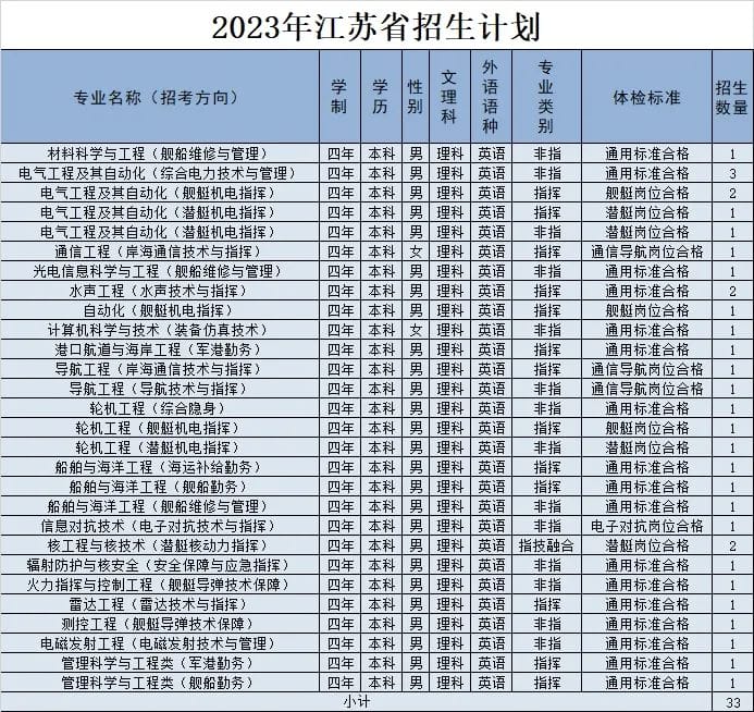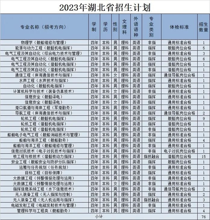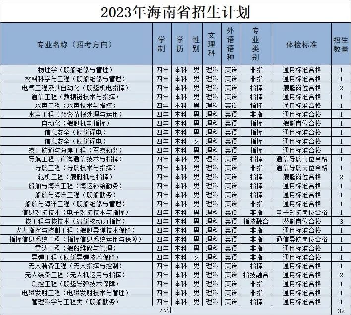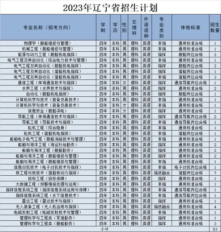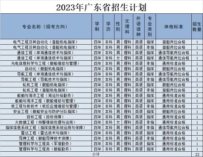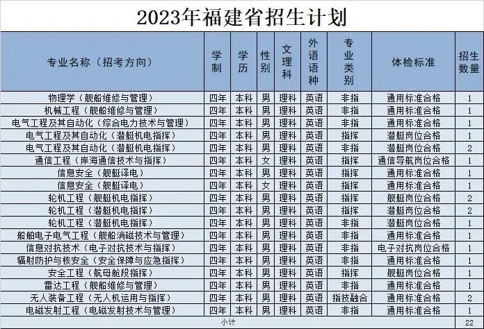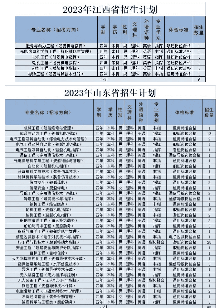 经教育部和军委机关批准,海军工程大学2023年招收普通高中毕业生计划正式发布。今年海军工程大学面向全国22个省(市)招收普通高中毕业825名,其中,男生785名,女生40名。以下为海军工程大学2023年各省(市)招收普通高中毕业生计划(生长军官本科青年学员),后附专业介绍,以及其他招生信息。