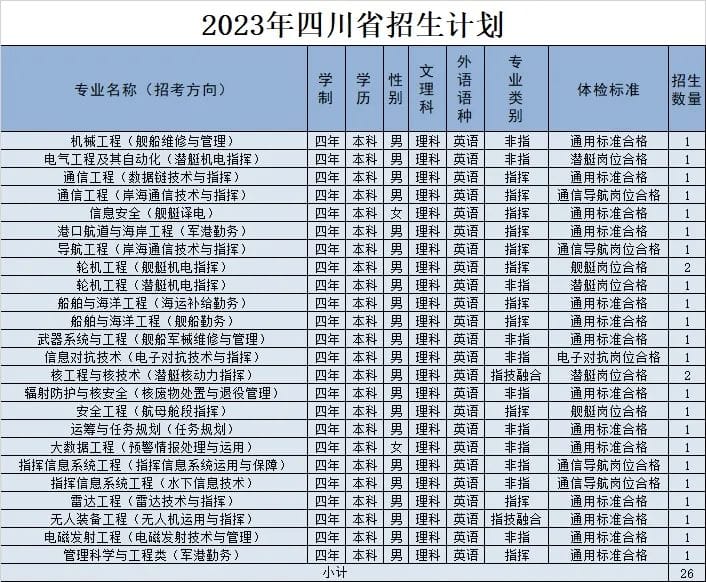 潜艇机电指挥——培养从事潜艇机电系统设计制造、机电指挥、使用管理、技术保障等的初级军官。主要课程有内燃机、潜艇AIP系统、潜艇电力推进、潜艇电气设备、潜艇操纵、潜艇装置与系统、潜艇动力系统监测与控制等。本科学制四年,授予工学学士学位。体检标准:潜艇岗位合格。